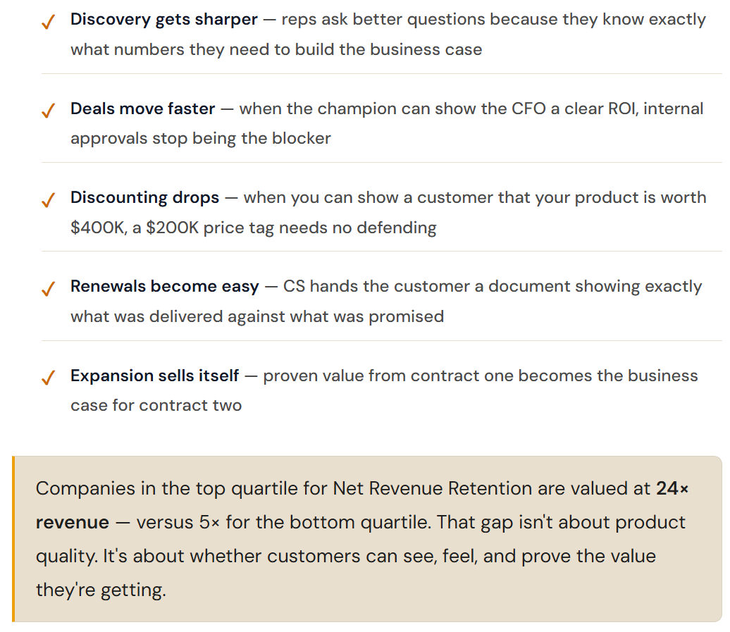 The result: higher win rates, less discounting, stronger NRR, and a sales team that talks about outcomes instead of features.