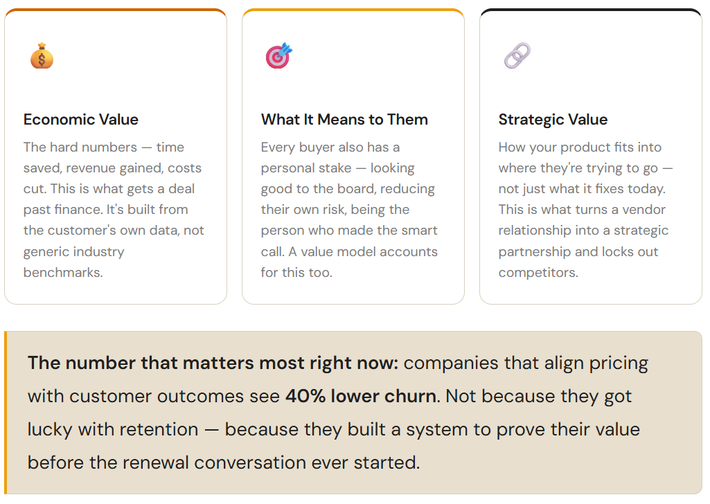 The answer isn’t pipeline, headcount, or a new sales methodology. It’s that your team is selling the wrong thing. They’re selling features when buyers need to hear outcomes. They’re selling capability when the CFO needs to see a number. And without a clear, documented picture of what your product is actually worth (in real dollars, to this specific customer), every conversation defaults to price.