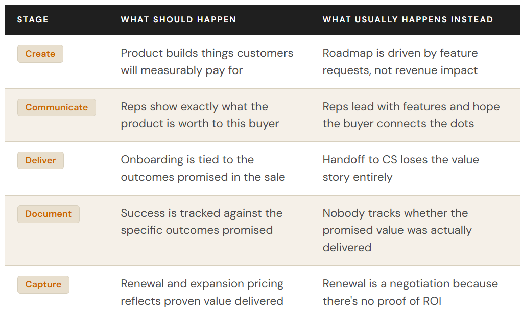 Most sales teams do one part of this well. They communicate value in the pitch. But they never build it into the rest of the motion…and that’s where the revenue leaks.
